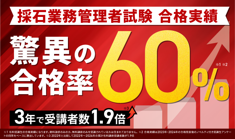 対象講座をお申込みいただいた方が2026年の採石業務管理者試験に合格された場合、合格特典(全額返金 or お祝い金1万円)がございます。