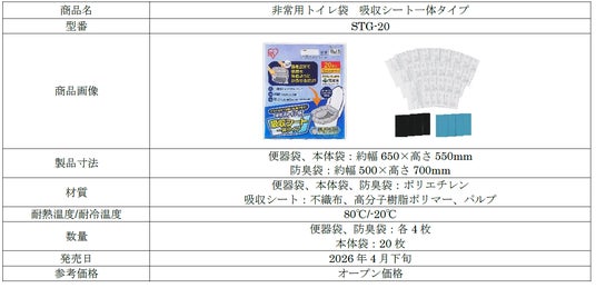 アイリスオーヤマ株式会社(本社:宮城県仙台市、代表取締役社長:大山 晃弘)は、2024年12月に宮城県と締結した包括連携協定に基づき、共同で「非常用トイレ袋 吸収シート一体タイプ」を開発しました。幅広い年齢層や認知症の方にも使いやすい本製品を、2026年4月下旬より全国のホームセンターやインターネットサイトなどを中心に順次発売(※1)します。