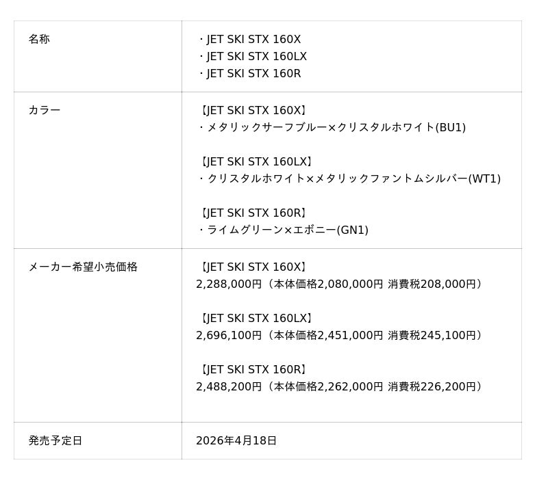 株式会社カワサキモータースジャパン(本社:兵庫県明石市、代表取締役社長:佐伯 健児)は、「JET SKI STX 160X」「JET SKI STX 160LX」「JET SKI STX 160R」を2026年4月18日(土)に新発売いたします。