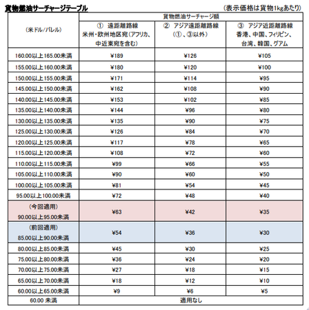 貨物燃油サーチャージテーブル (表示価格は貨物1kgあたり)