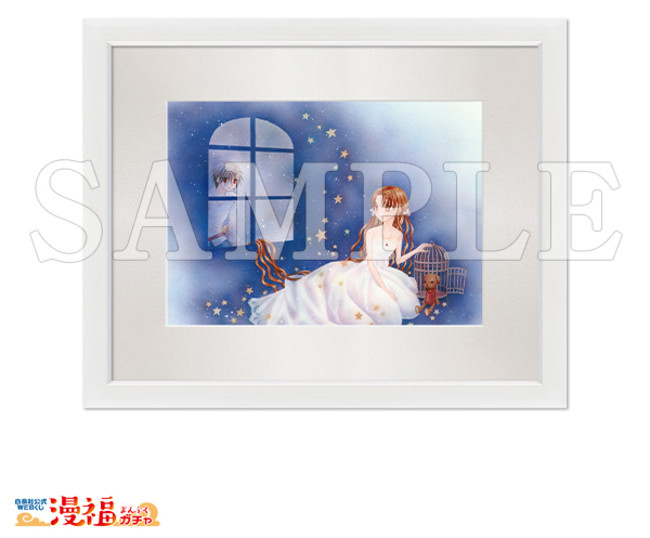 「ラプンツェル」イメージの巻頭カラーイラストと「卒業」イメージで描かれたセンターカラーイラストを額装高精細複製原画でお届けします。(イラストサイズ:約A5サイズ 額外寸:256×319mm)