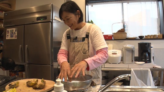 部屋の中で何やら黙々と作業をしているなおみさん、良く見てみると手にはナスが…大分在来種プロジェクトとして、モチトウキビや宗麟南瓜と共に、一生懸命育てた白ナスです。この日は来年に向けた種取り作業をするとのこと!色こそ白いものの、姿カタチは私たちにもお馴染みの見慣れたナス。一体このナスからどのようにして種を作り出すのでしょうか…?
