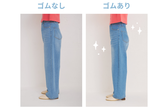 フレンチシックを提案するROPE' PICNICが、フレンチスタイルに欠かせないアイテムである“デニムパンツ”に焦点をあて、「トレンドのクロップド丈アイテムや、タックインのコーディネイトなど、多様なスタイリングを楽しんで欲しい」との思いで、さまざまな体型の方が自信を持って履くことができる、革命デニムを開発しました。ウエストを太いゴムでホールドしながらも、ストレッチを効かせたデニム素材で動きやすさも追求しています。
