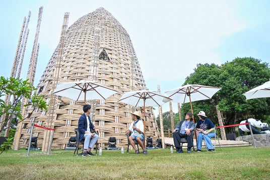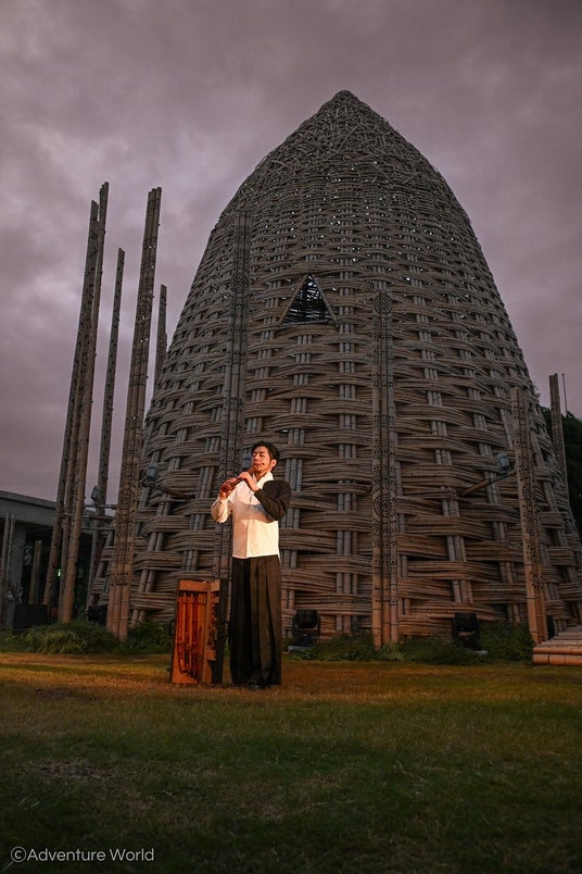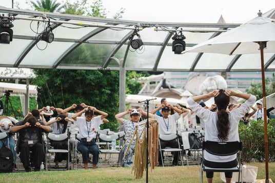 記念イベントではワン・ウェンチー 氏や池田親生 氏らによるトークイベント、舞踊パフォーマンスなどが行われ、パーク来場者に向けた一般公開もスタートしました。トークイベントでは、本アート作品「きらめく丘」が、大小2つの竹のドームとそれをつなぐ竹の回廊で構成されており、和歌山の雄大に連なる山々を表現されていること、そして、自然の竹で編まれた小ドームは「PLAY・あそび」、大ドームは「PRAY・祈り」の空間として、「動」と「静」が調和する場となり、訪れた人々がつながり、人・動物・自然、すべての生き物が調和する豊かな世界を願いともに問い続ける場所にしていくことが、語られました。