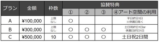 1.パンダバンブーアートプロジェクト2024公式Webページでの社名・ロゴ掲載、公式SNSでの企業・団体紹介、Panda Bamboo Art Projectの公式ロゴの使用権(商業利用不可、PRやCSR活動への利用限定)