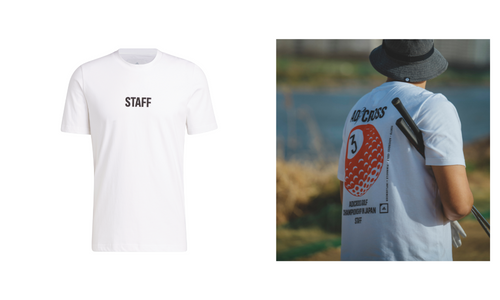 仮想トーナメント「ADICROSS GOLF CHAMPIONSHIP」のスタッフ用Tシャツ。後ろ身頃のインパクトのあるゴルフボールデザインがデザインアクセントとなります。