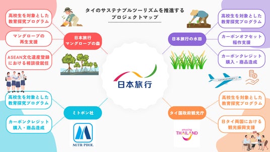 株式会社日本旅行(本社:東京都中央区、代表取締役社長:小谷野悦光)は、観光産業として脱炭素社会に貢献することを目的に、日タイ両国におけるサステナブルツーリズム推進の国際協力プロジェクトをスタートさせました。自治体・企業・教育マーケットに対し、タイの環境保全活動に参加することを通じ、環境保全に関するグローバルな視点を提供し、参加者自身の行動変容を促す取り組みです。この度、プログラムの開始にあたり、タイ各地におきまして2件の包括連携協定とカーボンクレジットの購入契約を締結しました。