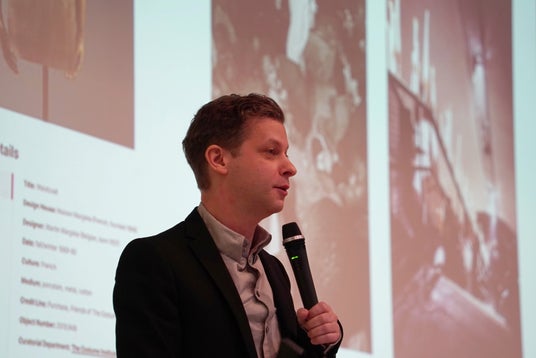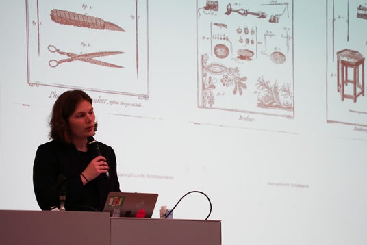 パリ市立モード美術館「パリ・ガリエラ」のエミリー・アマン氏は、サヴォアフェールを巡る研究史と、自身が関わる論文集およびパリ・ガリエラでの展覧会について発表しました。「服は完成品だけを見ても、その本当の価値はわからない。服が作られるまでの職人の手つき、工房の空気、作り手が協力する姿など、目に見えないプロセスこそが重要です」と語り、博物館の役割は、単に服を飾るだけでなく、そうした「職人のドラマ」を物語として伝える場所であるべきだと提案しました。