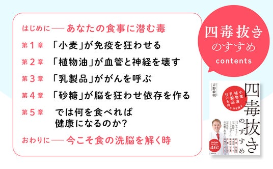 株式会社徳間書店 (本社:東京都品川区上大崎 代表取締役社長:小宮英行)は、吉野敏明氏の『四毒抜きのすすめ 小麦・植物油・乳製品・甘いものが体を壊す』(https://www.tokuma.jp/book/b664605.html)を6月18日(水)に発売いたします。