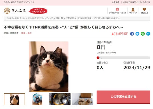 和歌山県橋本市とふるさと納税ポータルサイト「さとふる」を運営する株式会社さとふる(本社:東京都中央区、代表取締役社長 兼 CEO:藤井 宏明)は、「さとふるクラウドファンディング」にて、「不幸な猫をなくすTNR活動を推進~"人"と"猫"が優しく暮らせるまちへ~」の寄付受け付けを2024年9月2日より開始します。なお、本事業の「さとふるクラウドファンディング」での寄付募集は今回で3回目となります。