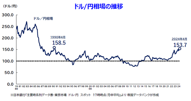 外国為替レートは、2021年以降円安傾向で推移し、2024年4月の月中平均(東京市場、17時時点)は、1ドル=153.7円となっている