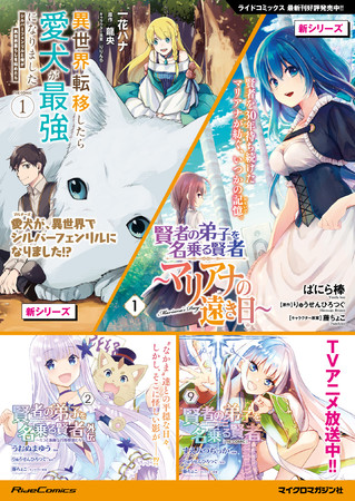 今月の新刊は、TVアニメ放映中の『賢者の弟子を名乗る賢者 THE COMIC 9』、賢でし公式スピンオフ『賢者の弟子を名乗る賢者外伝~ミラと素敵な召喚精霊たち~ 2』『賢者の弟子を名乗る賢者~マリアナの遠き日~1』、GCノベルズ話題作のコミカライズ『異世界転移したら愛犬が最強になりました~シルバーフェンリルと俺が異世界暮らしを始めたら~ THE COMIC 1』の4作品。
