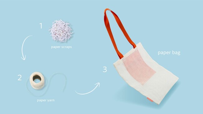 ノートや紙製品を製造する株式会社コクヨ工業滋賀(以下、コクヨ工業滋賀)では年間多くの紙端材が発生しており、これまでもトイレットペーパーやダンボールなどへのリサイクルに取り組んできました。今回のトートバッグでは、端材の中でもキャンパスノートなどの上質な紙だけを使用することで、これまでにないリサイクルの形として、再び日常生活で永く使える製品に生まれ変わらせることにチャレンジしました。上質な紙端材を10%配合した再生紙から作られた糸で織りあげ、布に仕立て、再生紙の豊かな素材感が味わえるよう、あえて着色せず、紙そのままの素朴な風合いに仕上げました。
