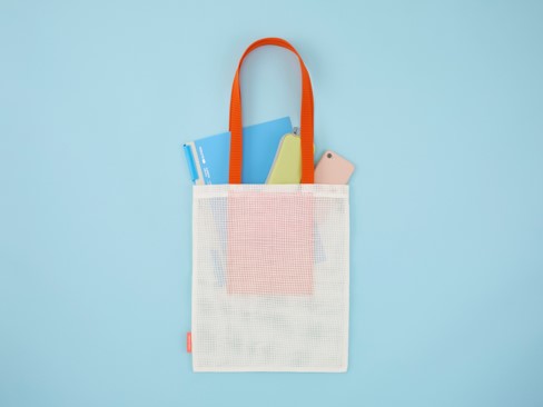 編み目から中身がほどよく透ける本体に、持ち手と内ポケット部にアクセントカラーとなるオレンジ色を採用し、軽快な印象に仕上げました。外側から中身が見えない内ポケットをつけ、持ち手は肩から下げやすい長さにしています。