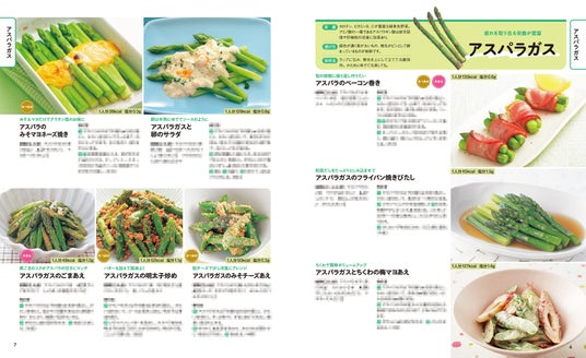 また、全レシピに1人分のカロリー・塩分量を表示しているので、健康のためカロリーが気になる方や、塩分量を気にしている方にも安心です。また、それぞれの項目には、栄養の話、選び方、保存法も表記しています。