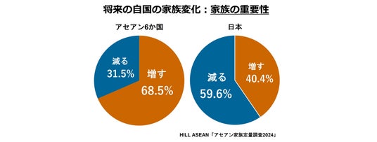 自国において家族の重要性がどう変化していくと思うかきいたところ、「重要性が増す」と回答したアセアン生活者は日本に比べて30ポイント近く高い。
