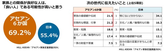 ・次の世代に伝えたいこととして、アセアンでは「家族の価値観や伝統」がトップ、次いで「宗教的な慣習、行事」。「良い人・良い家族」を育むために、日本では「人に迷惑をかけない」などの倫理観を大切にした教育がなされる傾向にあるが、アセアンでは「家族(一族)の伝統や価値観」「宗教的な慣習」を次の世代に継承していくことが重視されている。