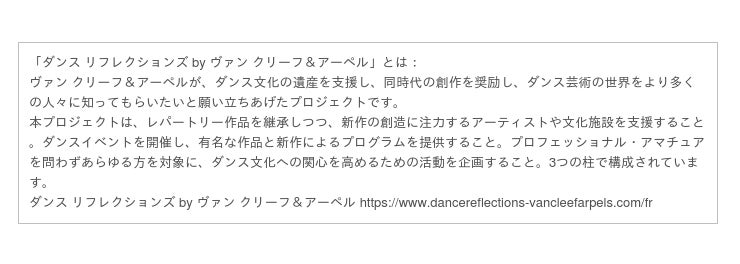 このプロジェクトを実施するために、2020年秋以降、世界中のダンスカンパニーや機関と数多くのパートナーシップを結び、2022年3月にはロンドンで第1回「ダンス リフレクションズ by ヴァン クリーフ&アーペル」フェスティバルを開催しました。