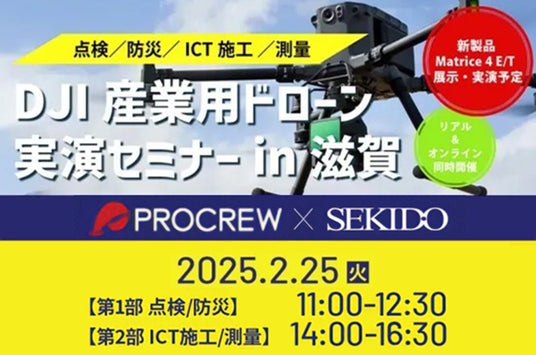 DJI(ディージェイアイ)正規販売代理店としてドローンビジネスの最先端を支える株式会社セキド(本社:東京都港区、代表取締役:大下貴之)は、株式会社プロクルー(本社:滋賀県長浜市、代表取締役:酒井正裕)と共同で2月25日(火)に、高所点検、防災、ICT施工、測量といった業務におけるドローン活用について、デモ飛行や取得データを交えてご紹介する「DJI産業用ドローン実演セミナー」を滋賀県米原市で開催、オンラインでも同時配信いたします。