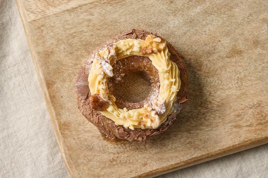 もちもち生地に、コクのあるきび糖ソースを加えたカラメル味のグレーズとバタークリームをのせました。周りにはチョコレートをトッピングし、ブッシュドノエルを表現したドーナツです。