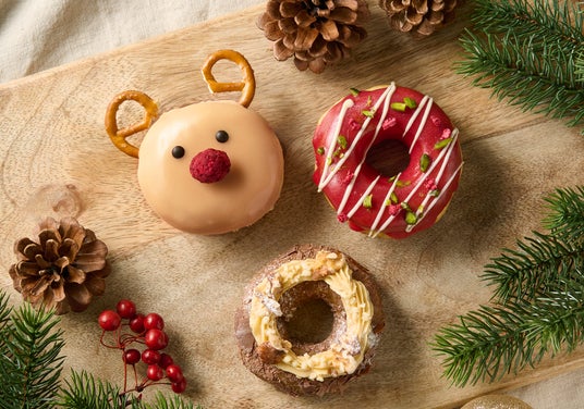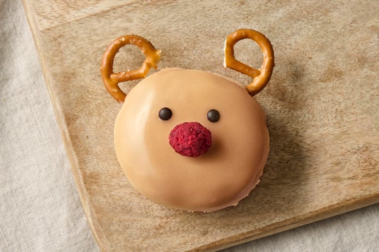 キャラメルベースのグレーズに、オーガニックプレッツェルのツノをプラスして、赤鼻には無添加のフリーズドライラズベリー。愛くるしいkoe donutsのトナカイが今年も登場です。