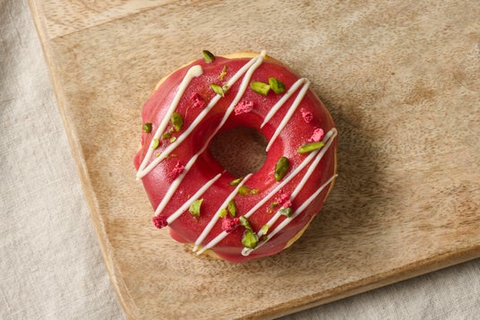 甘酸っぱい無添加ラズベリーピューレをグレーズに使用して、ホワイトチョコとドライラズベリー、ピスタチオをあしらいました。色鮮やかなホリデーリースのドーナツです。