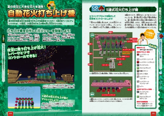 前半部で学んだレッドストーンに関する知識をフル活用して巨大装置の制作にもチャレンジ! 本書では、「TNTキャノン」や「自動花火打ち上げ機」「スライド式隠しドア」「自動収穫機&仕分け機」「巨大ピアノ」「エレベーター」など、大小織り交ぜ10種類の動く装置の作り方を紹介しています。