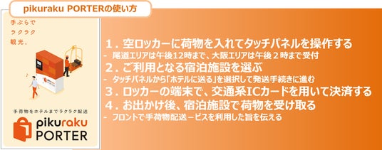 「pikuraku PORTER(ピクラクポーター)」とは、受付時間中に駅などに設置しているスマートロッカーに荷物を預けていただくと、当日の夕方までに宿泊先のホテルへ手荷物を配送するサービスです。SPACER 社のロッカーは、通常の荷物の預入機能に限らず、1 つのロッカー筐体で複数の機能を提供することが可能です。お客様は、無人のスマートロッカーのタッチパネルを操作し、手荷物を預け入れ、宿泊ホテルをご指定いただくのみで、手ぶらでの観光・移動を気軽にお楽しみいただけます。