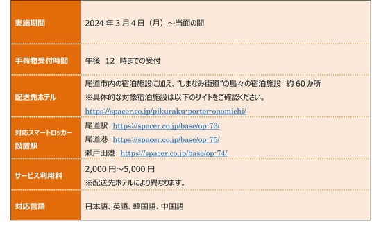 この度、ECサイトで購入した商品をスマートロッカーで受け取る現行サービス「pikuraku(ピクラク)」に続く新たなサービスとして、株式会社SPACER(本社:東京都中央区、代表取締役社長:田中章仁)と共同で、スマートロッカーを活用した新たな手荷物配送サービス「pikuraku PORTER(ピクラクポーター)」の実証実験を尾道エリアと大阪エリアで開始します。