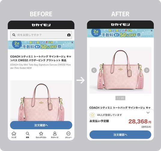 今回のリニューアルでは情報の優先度を見直し、商品画像、価格、セールやクーポンによる値引額、ウォッチリスト登録人数といった、購入検討に直結する重要な情報を最上部に集約いたしました。これにより、お客様はスクロールをせずに商品購入に必要な情報を取得でき、ストレス負荷のかからないショッピング体験ができます。