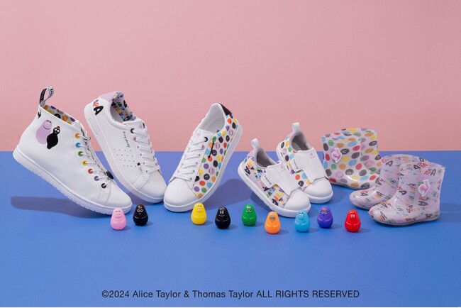 今回は個性豊かでカラフルなバーバパパファミリーをシューズにデザイン。かかと部分に大きくプリントされた「バーバパパ」のロゴグラフィックや、たまごから生まれた子どもたちを表現したドット柄など、親子お揃いの靴を履いてお出かけしたくなるようなカラフルでポップなコレクションになっています。
