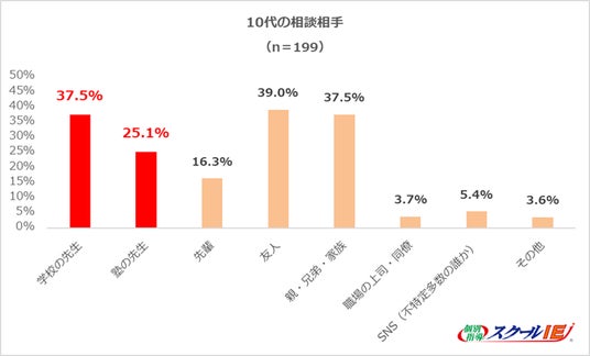 また、周囲に相談する人に対して、相談相手について聞いたところ、「友人(40.0%)」、「親・きょうだい(32.9%)」と身近な人へ相談する傾向があることがうかがえます。10代の相談相手としては、「友人(39.0%)」、「親・きょうだい(37.5%)」、「学校の先生(37.5%)」、「塾の先生(25.1%)」があげられ、友人・家族だけでなく、学校・塾の先生も身近な相談相手であることがわかりました。