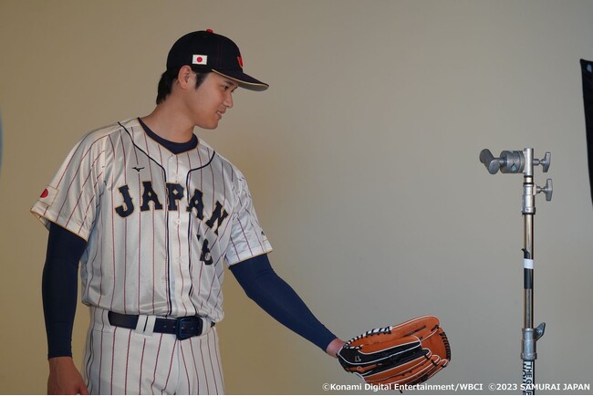 広告用のスチール撮影では試合用のユニフォームと、リラックスした普段着という2種類の衣装を撮影しました。2023年のWBCで着用した日本代表のユニフォームを身にまとい、さっそうとスタジオ入りした大谷選手は、まずはユニフォームの上からグレーのパーカーを羽織って普段着の撮影へ。「力強い感じで」「やや顎を引いて」というカメラマンのリクエストに応えて、腕を組んだバストアップ、顔の寄りとりりしい表情を見せると、続く腕組みを解いたリラックスしたポーズでは、「ハッピーな感じでいきましょう」という指示が飛び、魅力的なスマイルを立て続けに披露していました。
