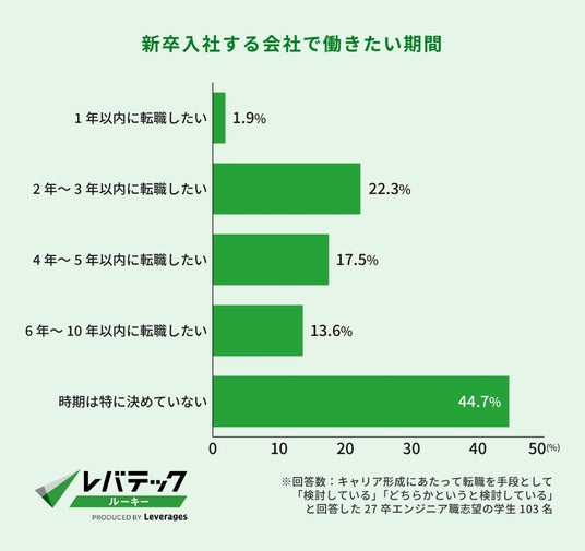 転職を視野に入れているエンジニア職志望学生が、新卒入社する会社で働きたい期間について「時期は決めていない(44.7%)」が多いものの、約4割が5年以内の転職を意識しています。新卒入社後、比較的早い段階での転職を検討する人が多いことが分かります。