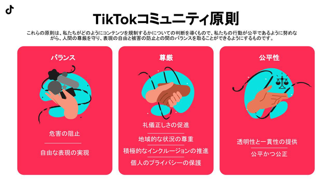 コミュニティガイドライン更新の一環として、TikTokの安全性を保ち、信頼を築くためにどのような基準で判断し、取り組んでいるかを理解してもらうために、「TikTokコミュニティ原則」(https://www.tiktok.com/community-guidelines/ja-jp/community-principles/?cgversion=2023 )を初めて皆さまに共有します。これらの原則は、人権擁護への取り組みに基づいており、国際的な法的枠組みにも沿っています。