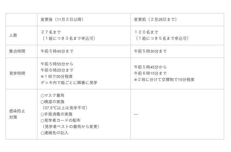 豊洲市場マグロ卸売場の見学者デッキについて、下記のとおり新型コロナウイルス感染防止対策を図った上で一般見学者の受け入れを再開いたしますので、お知らせいたします。