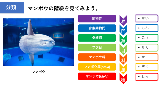 はじめに、「界門綱目科属種」分類クイズ。例えばアザラシとジュゴンは、ネコ目・ジュゴン目で分類上は遠いことなど、生き物の分類について座学で学びました。続いてマンボウの進化の過程を手元の資料とあわせてスライドで見ながら、3Dモデリングをするまでの大事な視点である研究のポイントをおさえます。