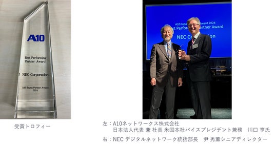 NECはこの度、A10ネットワークス株式会社(本社:東京都港区、以下A10ネットワークス)が主催する「A10 Japan Partner Awards 2024」において、「Best Performing Partner Award」を受賞しました。この栄誉ある賞は、2024年度(対象期間: 2024年1月1日~2024年12月31日)において、最も優れた販売実績を達成したパートナーに贈られるものです。