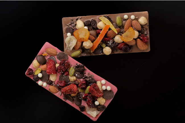 2種のタブレット型チョコレートにドライフルーツやナッツをあしらいました。フルーティーなルビーチョコレートにリッチなカカオの香りとミルクの味わい、さらにドライいちごを加えた「タブレット・ルビー&ミルク」と、甘みと苦みのバランスがとれたブラックチョコレートと濃厚なミルクチョコレートにドライオレンジや金柑をあしらった「タブレット・ビター&ミルク」をラインナップ。カカオの豊かな風味とトッピングした素材の食感が楽しいチョコレートです。