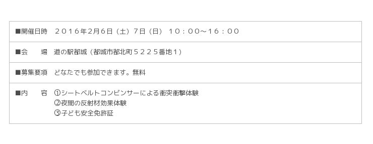 シートベルトは大切な命を守る命綱です。家族みんなで安全なドライブが楽しめるようぜひ体験しにご来場下さい。