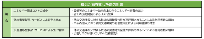 当社事業のうち、気候変動の影響が大きいと想定される鉄道事業を対象とし、国連気候変動に関する政府間パネル(IPCC)および国際エネルギー機関(IEA)による4℃シナリオ(現状を上回る温暖化対策を取らないことにより、産業革命時期比で気温が約4℃上昇し、気候変動による物理的変化に関するリスクが顕在化)と2℃未満シナリオ(抜本的なシステム移行が達成されることで、産業革命時期比で気温の上昇が2℃未満に留まり、低炭素経済への「移行」に関するリスクが顕在化)に基づき、事業に影響を及ぼす可能性のある短期・中期・長期のリスクと機会の洗い出しを行いました。中・長期かつ特に影響が大きいと特定したリスク・機会と、リスクへの対応策を別表に示しております。(次表参照)