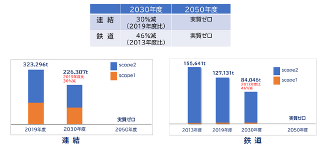 京王グループ(連結)の環境目標としてCO2排出量(scope1,2)の削減目標を設定しています。CO2排出量を 2050年度に実質ゼロとする目標を新たに掲げ、その中間目標である2030年度に連結として2019年度比30%、鉄道では2013年度比46%の削減を目指します。