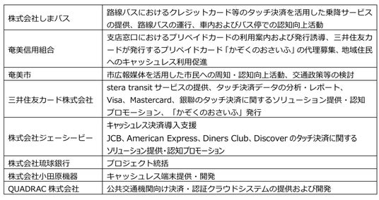 株式会社しまバス(本社:鹿児島県奄美市、代表取締役社長:岩崎 勇登)、奄美信用組合(本社:鹿児島県奄美市、理事長:手島 博久)、奄美市(本庁:鹿児島県奄美市、市長:安田 壮平)、株式会社琉球銀行(本社:沖縄県那覇市、代表取締役頭取:島袋 健)、三井住友カード株式会社(本社:東京都江東区、代表取締役 社長執行役員 CEO:大西 幸彦)、株式会社ジェーシービー(本社:東京都港区、代表取締役会長兼執行役員社長:二重 孝好)、株式会社小田原機器(本社:神奈川県小田原市、代表取締役社長:津川 直樹)、QUADRAC株式会社(本社:東京都中央区、代表取締役社長 高田 昌幸)は、2026年3月31日(火)より、官民一体で奄美大島におけるキャッシュレス化推進に向けた取り組みを開始します。
