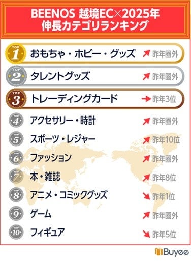 ・2025年の越境ECで伸長率の高かった商品カテゴリは1位「おもちゃ・ホビー・グッズ」、2位「タレントグッズ」、3位「トレーディングカード」