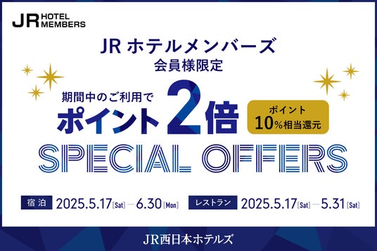 株式会社ジェイアール西日本ホテル開発(京都府京都市下京区、代表取締役社長 伊勢正文)は、展開するJR西日本ホテルズにて、宿泊(※1)・レストランのご利用を対象に、期間限定でJRホテルメンバーズポイントの付与が通常の2倍になる「JRホテルメンバーズ会員様限定ポイント2倍スペシャルオファー」を、2025年5月17日(土)から実施します。