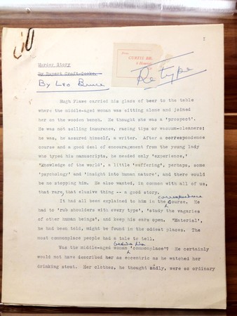 よく見ると、あちこちに(おそらく著者本人による)赤字が記入されているほか、本名のルーパート・クロフト‐クックの名前でいったんタイプされた署名が、手書きで「レオ・ブルース」に直されているのがわかる。「表の顔」である作家クロフト‐クックとしていったん執筆しながら、ミステリー寄りの内容に鑑みて、後からブルース名義に書き換えた可能性などを考えると、きわめて興味深い。