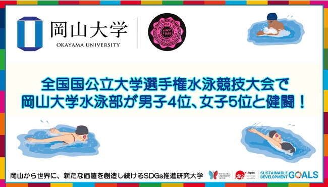 なお、同部は、7月2日~3日に児島マリンプール(倉敷市)で開催された中国五大学学生競技大会では、男女ともに優勝。7月9日~10日に島根県立水泳プール(島根県松江市)で行われた第53回中国四国学生選手権水泳競技大会(中四インカレ)では、男子が優勝、女子が準優勝でした。