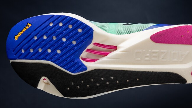 前足部先端のContinental™ラバーがあらゆる天候、コンディション下における優れたグリップ力と、スリップによるエネルギーロスの軽減に貢献。さらに、その他大部分に配されたTEXTILE RUBBERが鋭い摩擦によるグリップ性とシューズ全体の軽量性に貢献。