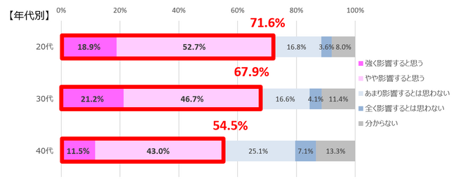 髪の自己表現が部活参加意欲向上やパフォーマンスアップに繋がると思うと回答した人は、全体では64%でした。年代別では、20代が71.6%と最も多く、40代の54.5%とは17.1%の差が見られ、世代によって意識が異なる結果に。