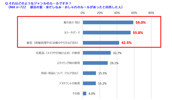 また、ルールのジャンルにおいては、髪の長さ・短さが59.0%と最も多く、カラーやパーマが55.8%、髪型が42.5%と上位3つが髪に関する内容でした。